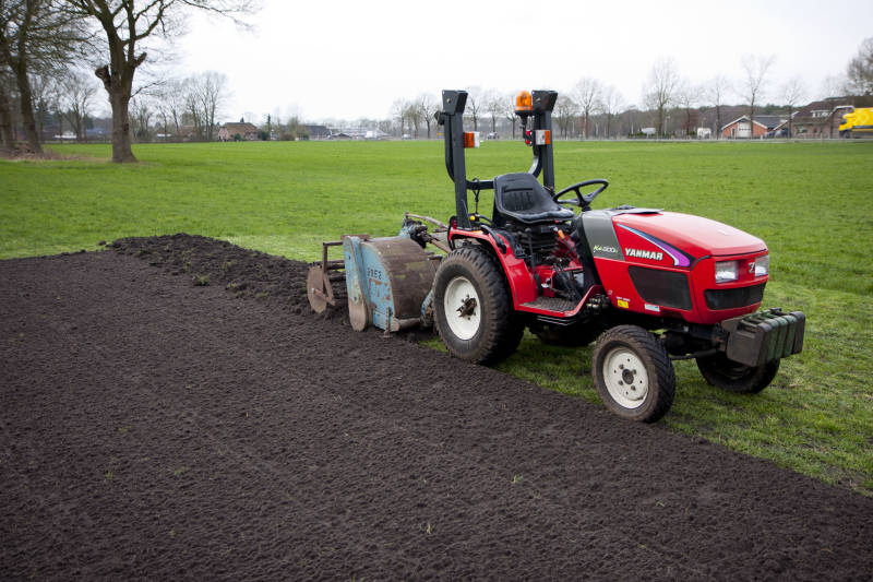 Het groene gras zal door de overtopsfrees naar onder gewerkt worden waardoor het zand erbovenop komt te liggen.